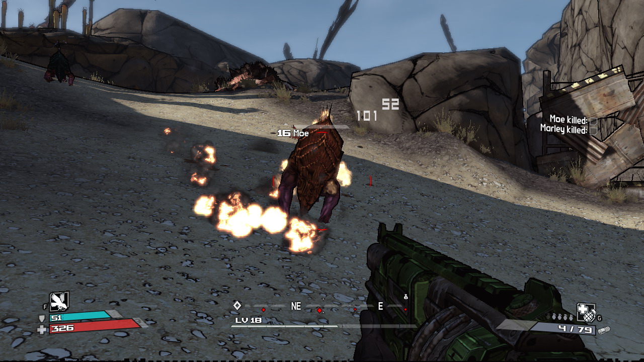 的內容與主線故事(Vault)本身的關係不大,這些因素亦令大大減低主線故事的張力,使故事性看似薄弱。每當玩家發現新地區後,都有機會出現新支線任務,而Claptrap也會在這時提示玩家可以從NPC或Bounty Board上取得(但有時也要自己發掘)。當玩家選擇計劃進行的任務之後下方的羅盤都會提示任務方位,算是貼心方便的設計,不過部份指示並非指向目標而是大概區域,這就要玩家自己尋找目標了。